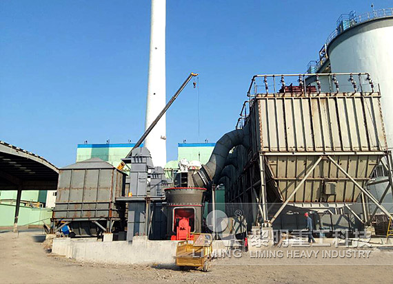 合格的石灰石塊料通過(guò)鏟車送入原料斗,經(jīng)手動(dòng)插板閥進(jìn)入底部的皮帶機(jī),并通過(guò)提升機(jī)輸送至立磨。物料從進(jìn)料口落入磨盤(pán)中央,在離心力的作用下,物料從磨盤(pán)中央向邊緣均勻移動(dòng),經(jīng)過(guò)磨盤(pán)上的粉磨輥道區(qū)域時(shí),受到磨輥的碾壓,大塊物料直接被壓碎,細(xì)粒物料受擠壓后形成料床進(jìn)行粒間研磨。被研磨的物料繼續(xù)向磨盤(pán)邊緣移動(dòng),直到被風(fēng)環(huán)處的強(qiáng)氣流帶走,而較大的顆粒物料又重新掉落到磨盤(pán)上繼續(xù)研磨。氣流中的物料經(jīng)過(guò)上部的分析機(jī)時(shí),在分析機(jī)的作用下,粗顆粒重新回到磨盤(pán)上粉磨,合格的細(xì)粉隨氣流一起出磨。細(xì)度合格的細(xì)粉出磨后進(jìn)入脈沖收塵器,并通過(guò)底部出料口之間的鎖風(fēng)閥進(jìn)入倉(cāng)泵進(jìn)行輸送。混入物料的鐵塊等雜物隨物料運(yùn)動(dòng)到磨盤(pán)邊緣時(shí),由于自身重量大而不能被風(fēng)吹起,跌落至磨機(jī)下腔,從排渣口排出機(jī)外。
